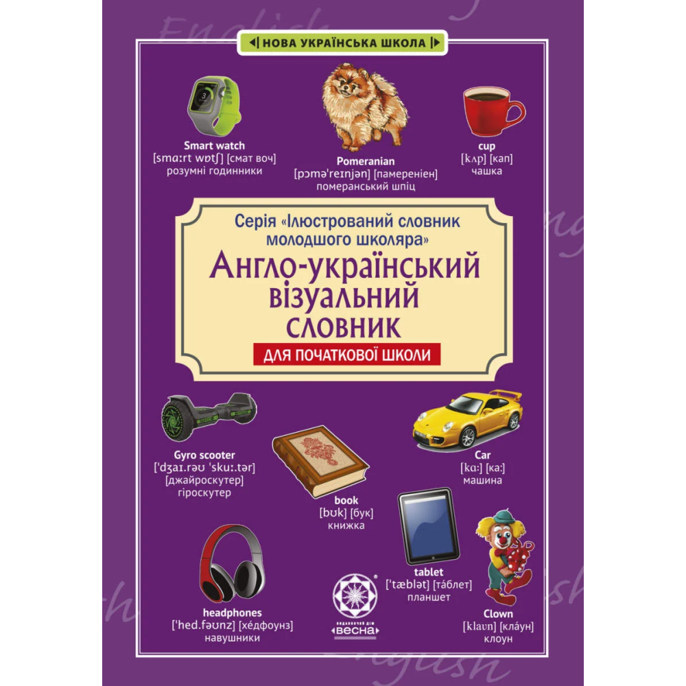 Англо-український візуальний словник в малюнках з транслітерацією — це навчальний посібник, створений спеціально для дітей молодшого шкільного віку, які роблять перші кроки у вивченні англійської мови. У словнику зібрано близько 2000 слів і словосполучень, розподілених за тематичними розділами, що полегшує запам’ятовування мовного матеріалу через асоціацію з малюнками.
