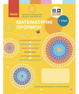 Математичні прописи для 1 класу НУШ авторів Світлани Скворцової та Оксани Онопрієнко створені відповідно до програми Нової української школи. Посібник допомагає першокласникам навчитися правильно писати цифри, орієнтуватися на сторінці та виконувати перші математичні завдання.