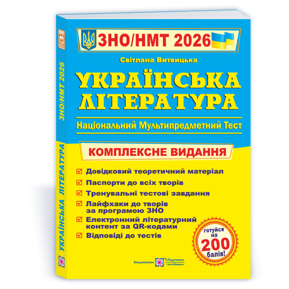 Посібник «Українська література. Комплексна підготовка до ЗНО / НМТ 2026» авторки Світлани Вітвіцької призначений для учнів старших класів і абітурієнтів, які готуються до вступних випробувань з української літератури. У виданні подано систематизований теоретичний матеріал, що охоплює всі теми шкільної програми, а також тестові завдання різних рівнів складності у форматі НМТ. Посібник допомагає повторити основні літературні твори, проаналізувати ключові образи та підготуватися до виконання тестів. Завдяки структурованому поданню матеріалу книга підходить для самостійної підготовки, роботи на заняттях і системного повторення перед складанням НМТ.